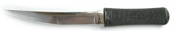 A key part of this system is the Hissatsu based on an old Japanese design. The unique shape of the blade, made famous by the legendary Samurai warlord Takeda Shingen, provides enormous penetrating power and superior slashing capability in one blade, which works with the natural motion of the body. James arrived at this modern version as a backup weapon for close-quarters combat. This is a focused single-purpose knife for use in anti-terrorist/close-quarters battle (CQB) environments, either as a primary or a secondary weapon to augment the handgun in the hands of trained professionals.