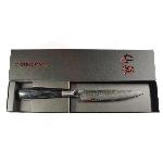 Překrásný všeobecně použitelný nůž Utility ze série Suncraft Senzo Classic Tsuchime Damascus s ultra ostrým řezným jádrem z japonské oceli VG10, HRC 60-61, které je vloženo mezi 32 vrstev měkké nerezové damaškové oceli. Ta zajišťuje mimořádnou pevnost, odolnost a houževnatost. Nůž Utilityje užitečnou alternativou velkého šéfkuchařského nože v okamžiku kdy potřebujete přesné řezy nebo například krájení zelených fazolí nebo jiné menší zeleniny a ovoce. Jsou vhodné též pro špikování a krájení masa. Zaoblené ostří umožňuje mírné kývání při řezu. Jeho ostrost je ideální pro přípravu sendvičů všeho druhu. Japonské umění a nové technologie činí tento nůž jedinečným a nenapodobitelným.