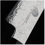 Je vyrobený z vrstvené damaškové oceli s extrémně tvrdým jádrem z prémiové práškové oceli ZDP-189, která dosahuje tvrdosti až HRC 65–67. Díky tomu si nůž uchovává extrémní ostrost po dlouhou dobu a minimalizuje nutnost častého broušení. Každý kus je originál – čepel s 49 vrstvami damaškové oceli vytváří nádherný vlnitý vzor, který podtrhuje mistrovství zkušených nožířů. Rukojeť je vyrobena z luxusní stabilizované dřevo-pryskyřice, doplněná o elegantní prstence z pryskyřice a kovu. Šestihranný tvar rukojeti zajišťuje jistý a pohodlný úchop jak pro praváky, tak pro leváky.