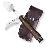 Součástí tohoto praktického setu je výklopná lopatka pro šetrné vyjmutí houby ze země a jemný štěteček na konci rukojeti pro okamžité očištění od jehličí a hlíny. Nůž je dodáván v ručně zpracovaném koženém pouzdru, které lze snadno připevnit na pásek.